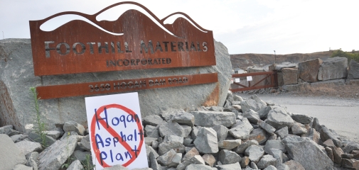 “No Asphalt Plant” sign at entry to Foothill Materials, Hogan Quarry